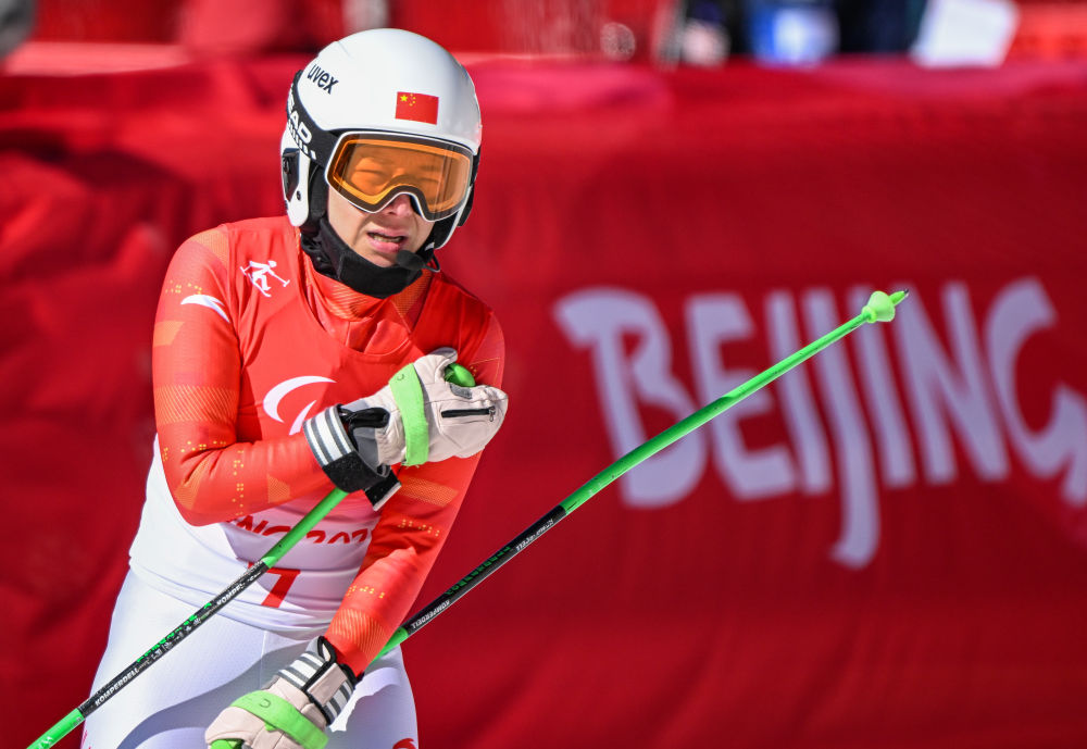 ↑ 3月5日,中国选手朱大庆在残奥高山滑雪项目女子滑降(视障)比赛后。