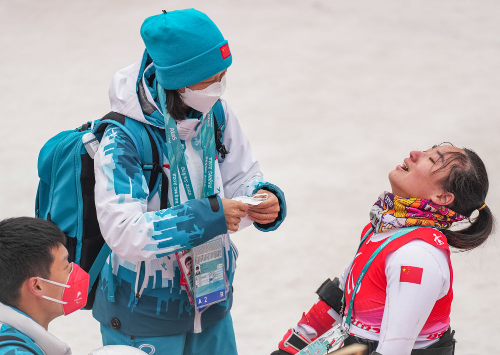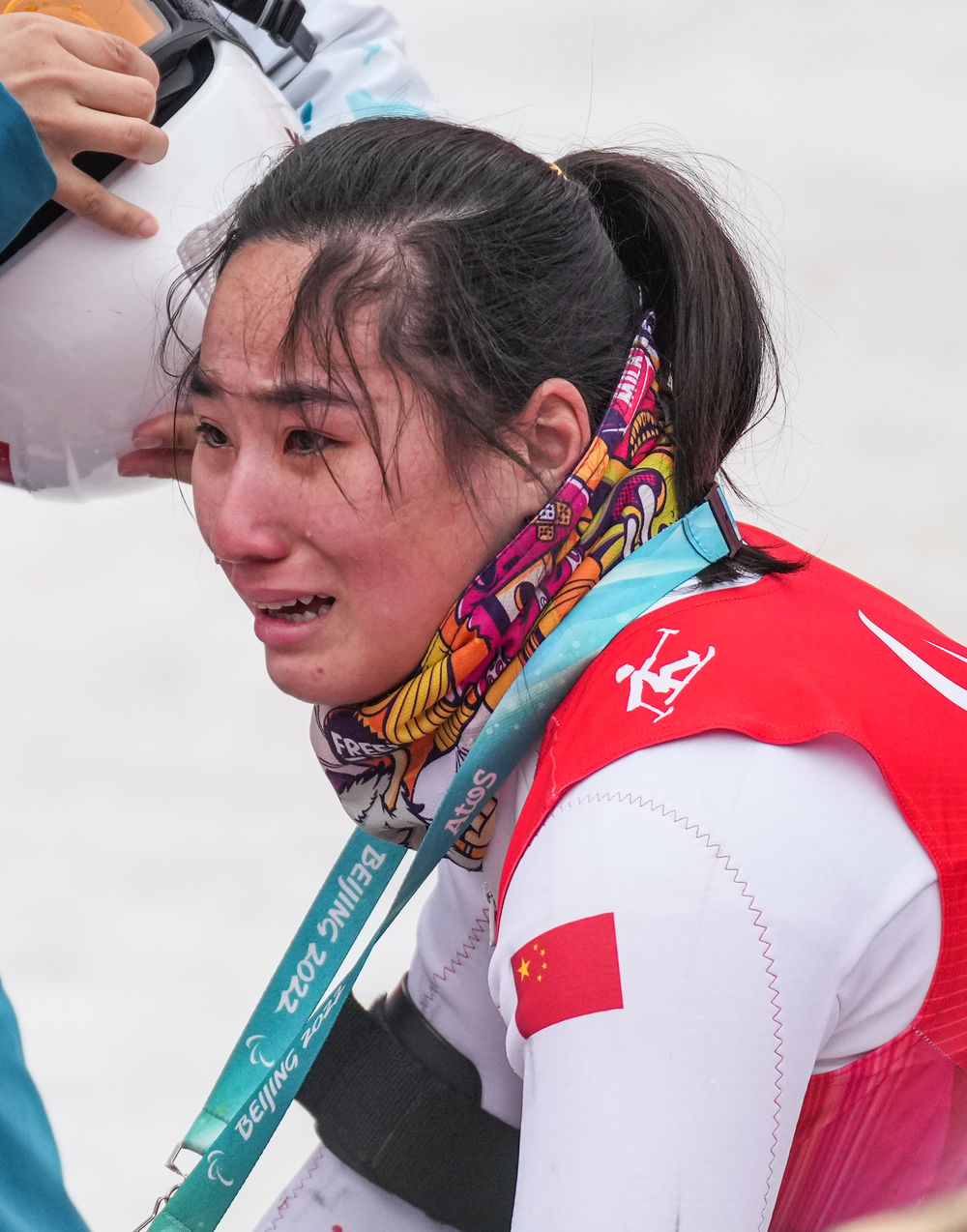 ↑3月11日,中国选手张雯静在残奥高山滑雪女子大回转(坐姿)比赛后哭泣。