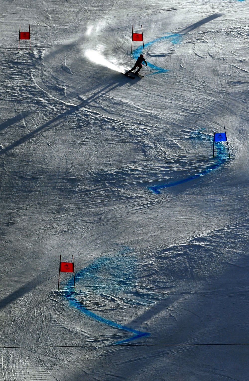 从3月10日起,所有的比赛因高温提前至8点半开始。10日早上我抵达拍摄位置后发现,因比赛时间提前,我面对的雪道正处于逆光状态。这是之前比赛所没有出现过的,也给了我一个能利用光影进行创作的惊喜。阳光的覆盖面很窄,运动员穿过亮光的时间非常短,我抓住这有限的拍摄机会,拍到了与之前不同的照片。
