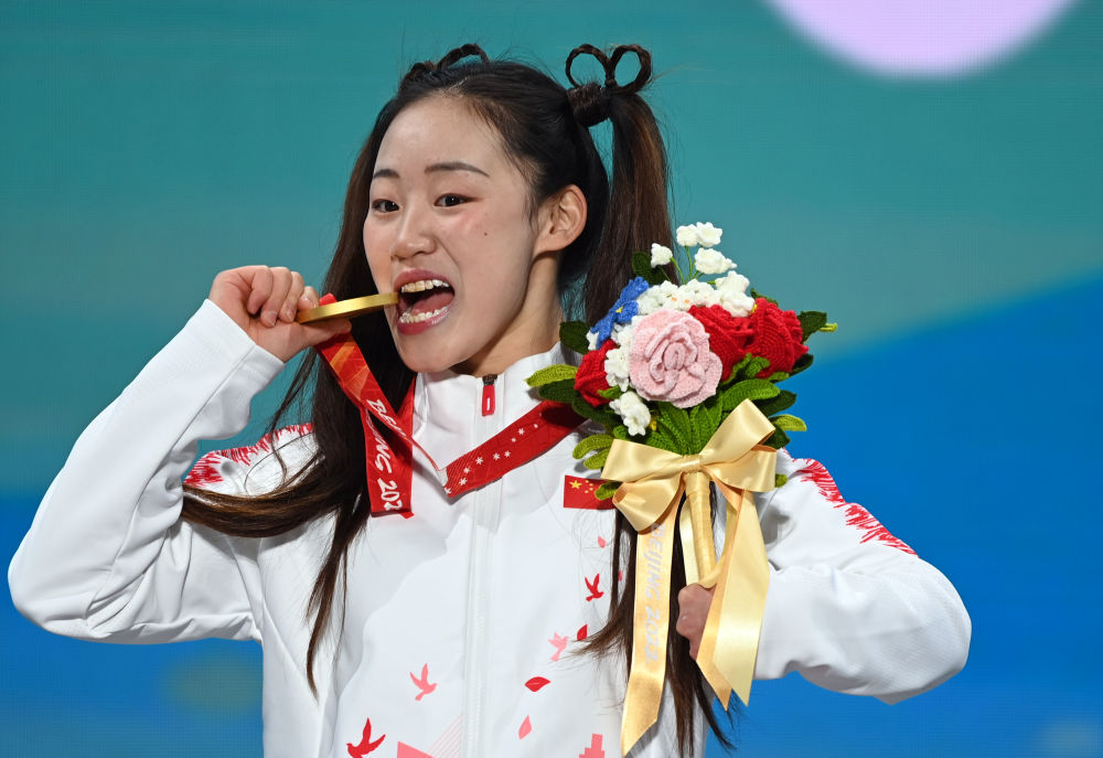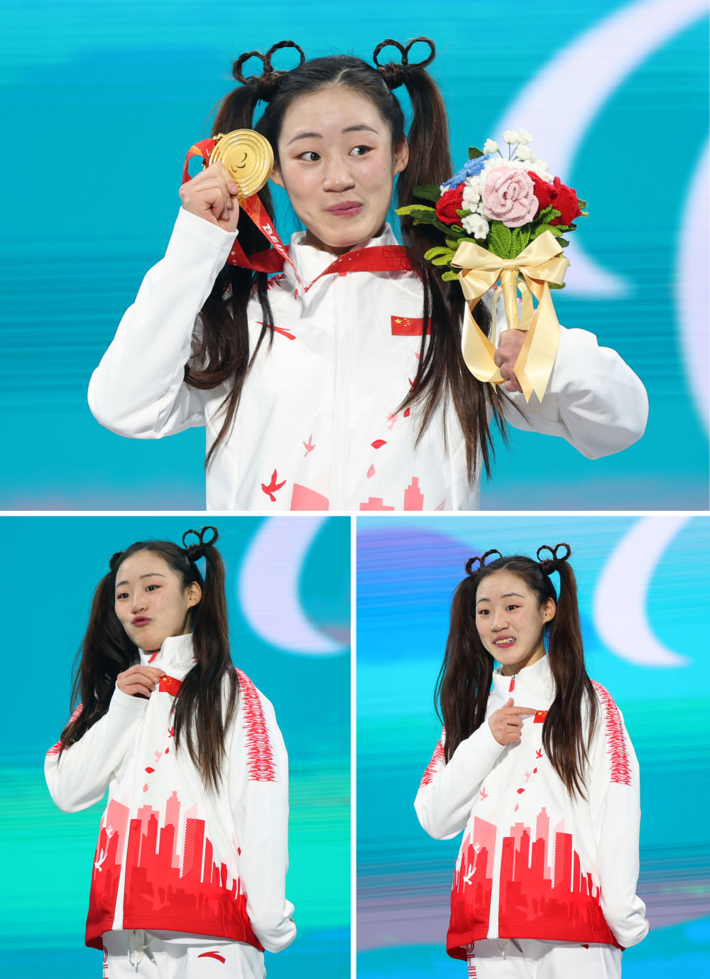 ↑ 3月6日,获得金牌的中国选手张梦秋以双马尾的发型亮相颁奖仪式,喜悦之情溢于言表。