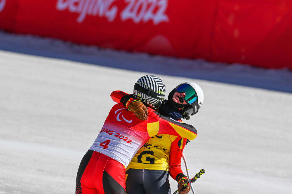 ↑ 3月6日,中国选手张梦秋(左)与在残奥高山滑雪女子超级大回转(站姿)项目夺冠后与队友郭佳欣拥抱庆祝。