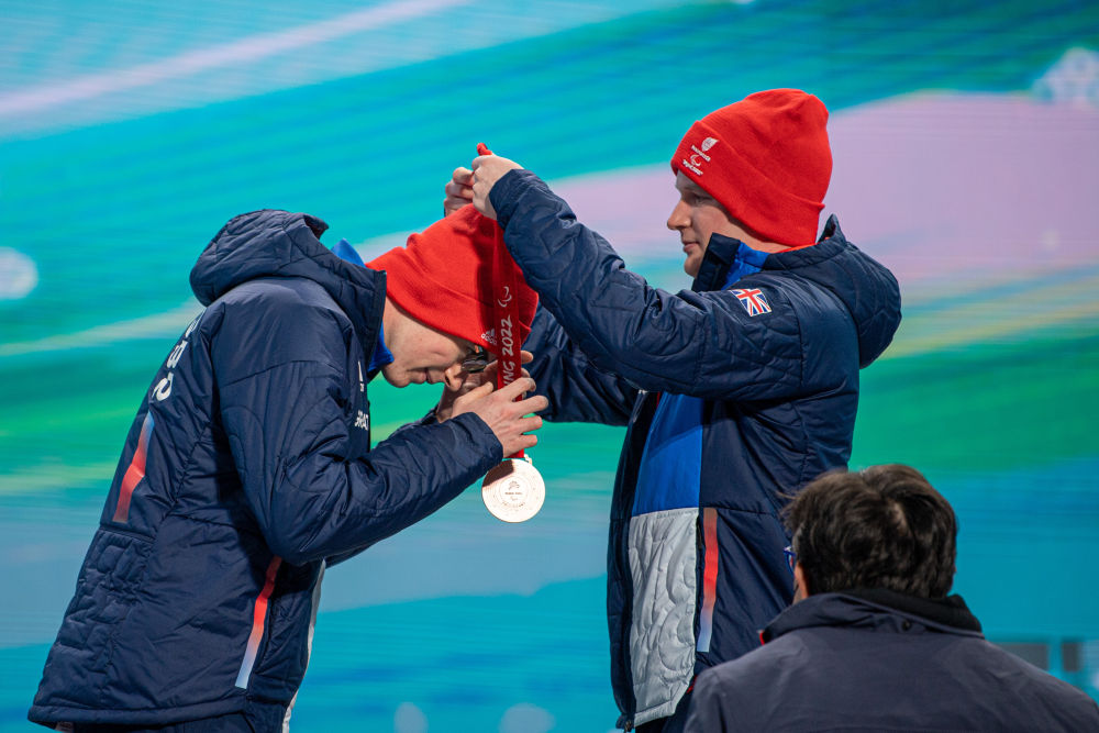 ↑ 3月8日,在北京冬残奥会残奥高山滑雪男子全能(视障)颁奖仪式中,哥哥安德鲁·辛普森给获得铜牌的弟弟尼尔·辛普森挂上奖牌。
