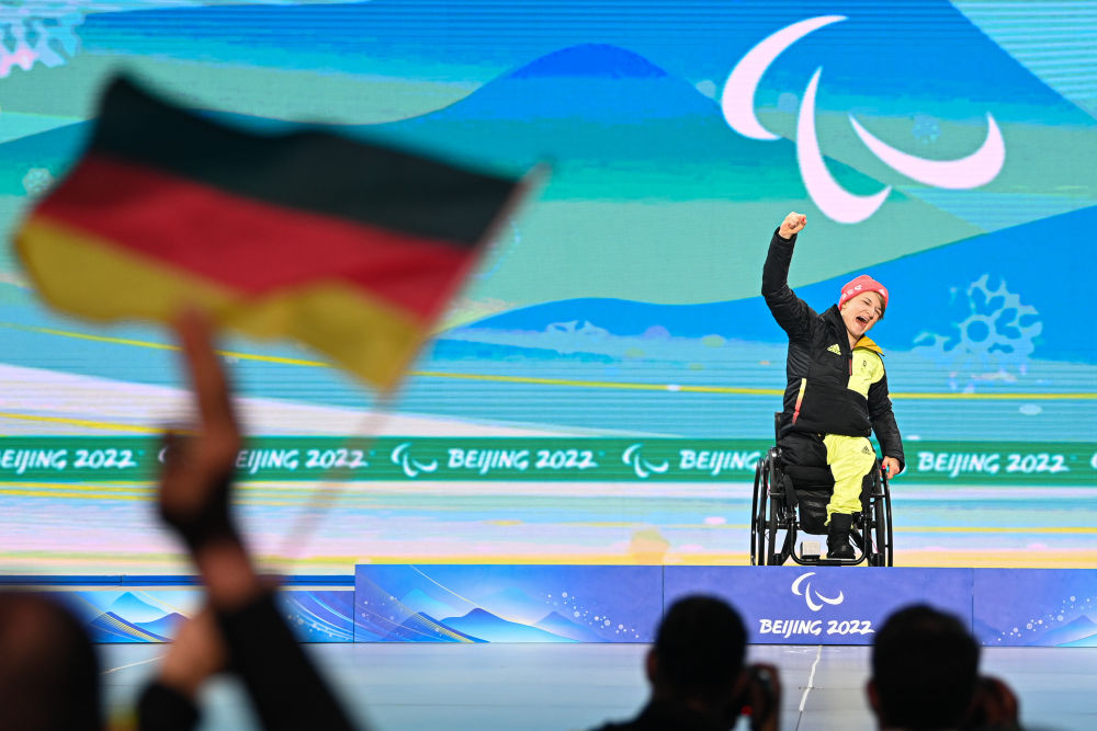 ↑ 3月12日,在残奥高山滑雪女子回转(坐姿)比赛中获得金牌的德国选手安娜-莱娜·福斯特在颁奖仪式上庆祝时,台下挥舞起德国国旗。