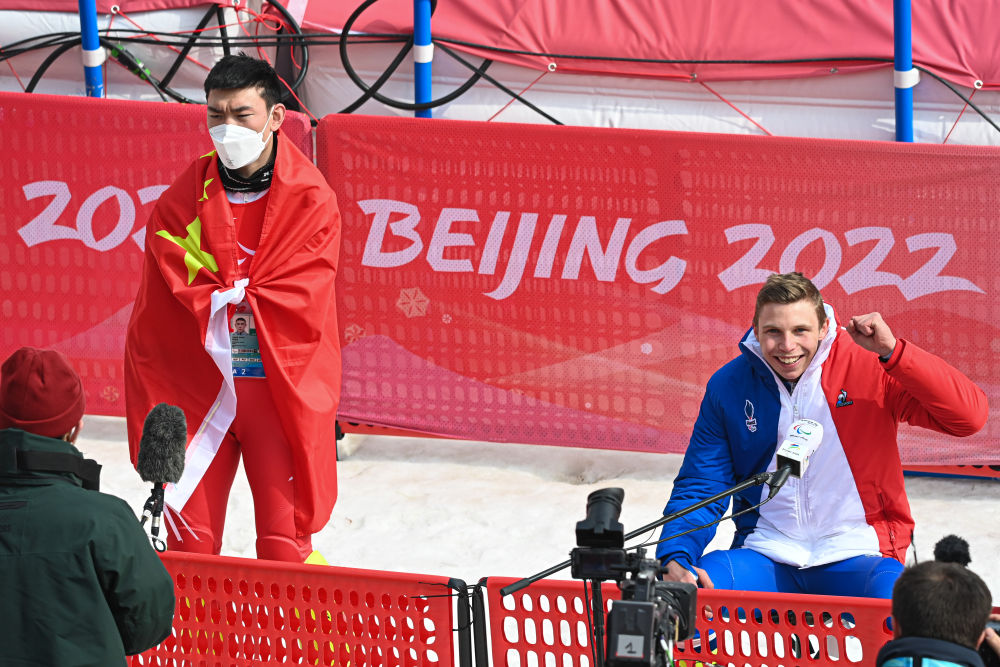 ↑ 3月13日,在残奥高山滑雪男子回转(站姿)比赛中获得金牌的法国选手阿蒂尔·博谢(右)、获得银牌的中国选手梁景怡赛后在混合采访区接受采访。
