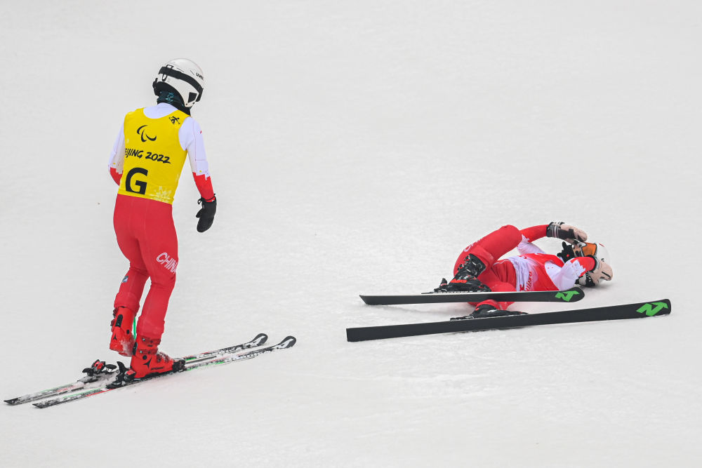 ↑ 3月11日,中国选手朱大庆(右)在残奥高山滑雪女子大回转(视障)比赛中冲过终点后受伤倒地。赛后得知,本届冬残奥会朱大庆是带伤参加的。她在参加的5场比赛中获得3银1铜的好成绩。
