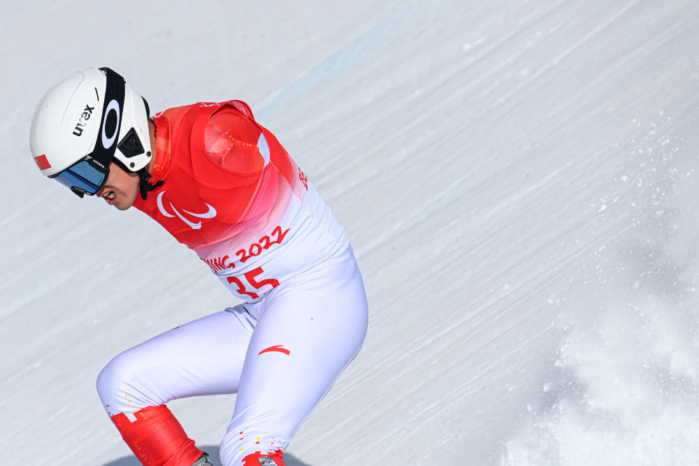 ↑ 3月6日,中国选手孙鸿胜在残奥高山滑雪男子超级大回转(站姿)比赛中,他是中国残奥高山滑雪队中唯一一名没有双臂的运动员。