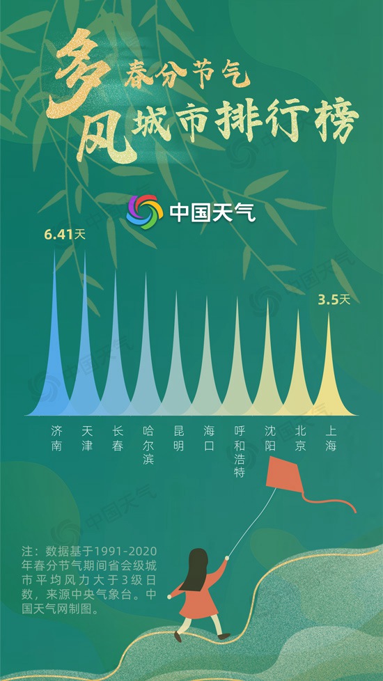 中国天气网盘点近30年大数据发现,春分节气期间,我国风较多的省会级城市大部分来自北方,在多风城市排行榜TOP10中占据7席。其中东北、黄淮等地的风“打卡频率”较高,济南排在第一位,平均每年春分节气期间超过6天平均风力在3级以上。