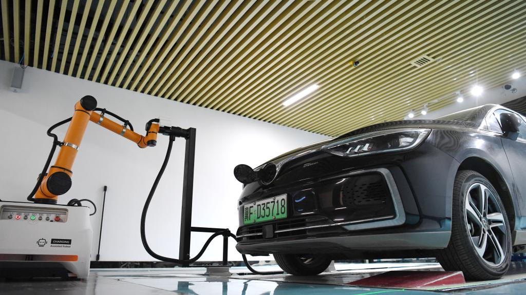 在剧村站智慧充电区,插拔枪机器人对一辆电动汽车进行充电。(新华社记者朱旭东摄)