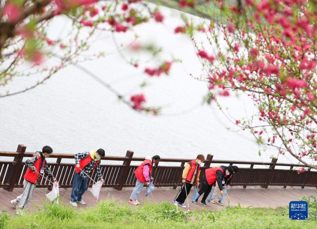 3月21日,在湖南省衡阳市雁峰区东洲岛上,南华大学土木工程学院志愿者在净滩护水行动中捡垃圾。