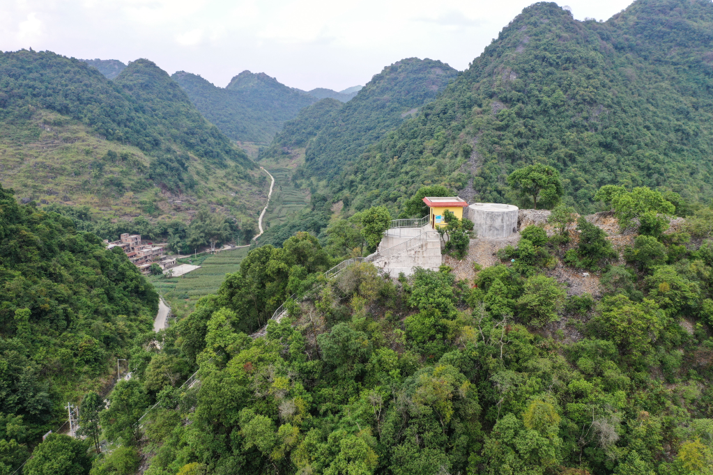 这是地处广西隆安县都结乡陇选村附近山顶上的自来水加压站(2019年10月16日,无人机拍摄)。新华社记者 曹祎铭 摄