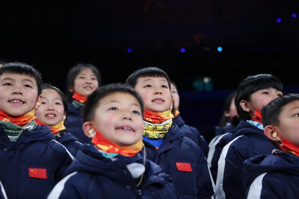 在国家体育场(鸟巢),马兰花儿童合唱团的孩子们在场上彩排(1月26日摄)。新华社记者 许雅楠 摄