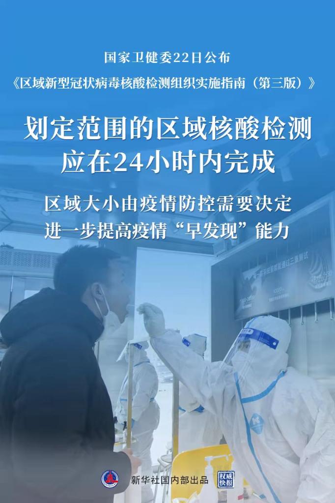 国家卫生健康委3月22日公布《区域新型冠状病毒核酸检测组织实施指南(第三版)》,将第二版指南中的“全员”修改为“区域”,区域大小由疫情防控需要决定;强调核酸检测应该目标明确、有的放矢,不能搞“一刀切”;明确推进“抗原筛查、核酸诊断”的监测模式……新版指南看点几何?