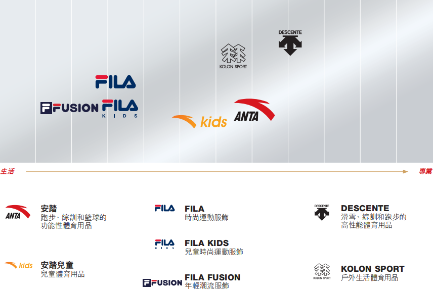 目前,中国运动鞋服市场份额最高的五大品牌中,安踏集团占据两席,分别为安踏ANTA(9.3%)和斐乐FILA(7%)。而安踏儿童ANTA KIDS份额达2%,领先耐克儿童NIKE KIDS(1.8%)与阿迪达斯儿童ADIDAS KIDS(1.6%) , 是份额最高的儿童运动鞋服品牌。
