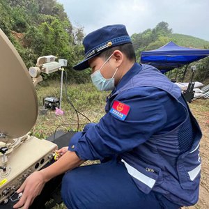 3月22日,工作人员在东航MU5735客机坠毁事故救援现场架设通信设备(手机照片)。新华社记者 周华 摄