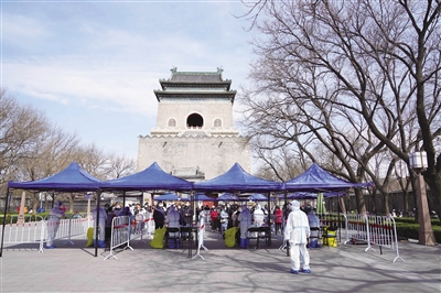 3月21日,在北京市东城区安定门街道钟鼓楼文化广场核酸采样点,医护人员为居民进行核酸采样。 新华社记者 鞠焕宗 摄