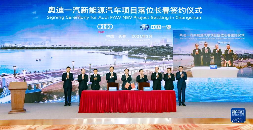 2021年1月18日,中国一汽、德国奥迪公司、长春市政府以视频连线方式签署三方协议,宣布一汽奥迪新能源汽车项目落户长春。新华社发