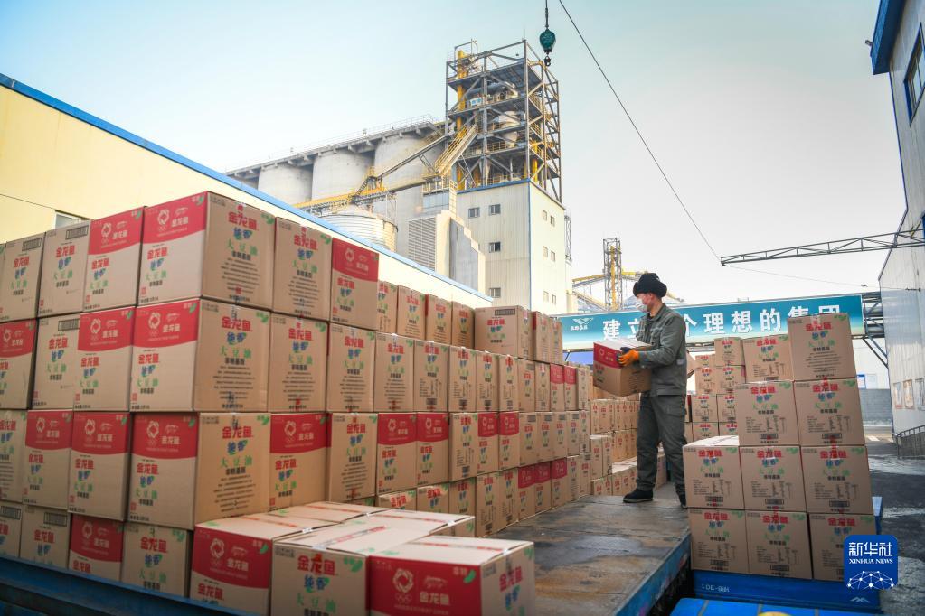 2020年2月20日,在益海嘉里(哈尔滨)粮油食品工业有限公司园区,工人在搬运产品。新华社记者 王松 摄