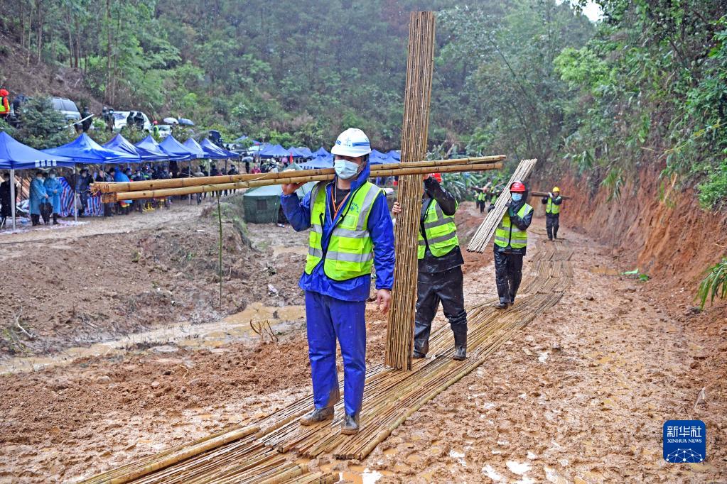 3月23日,工作人员在坠机事故现场搬运铺设道路的竹排。新华社记者 周华 摄