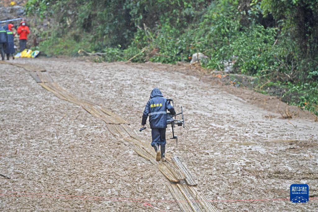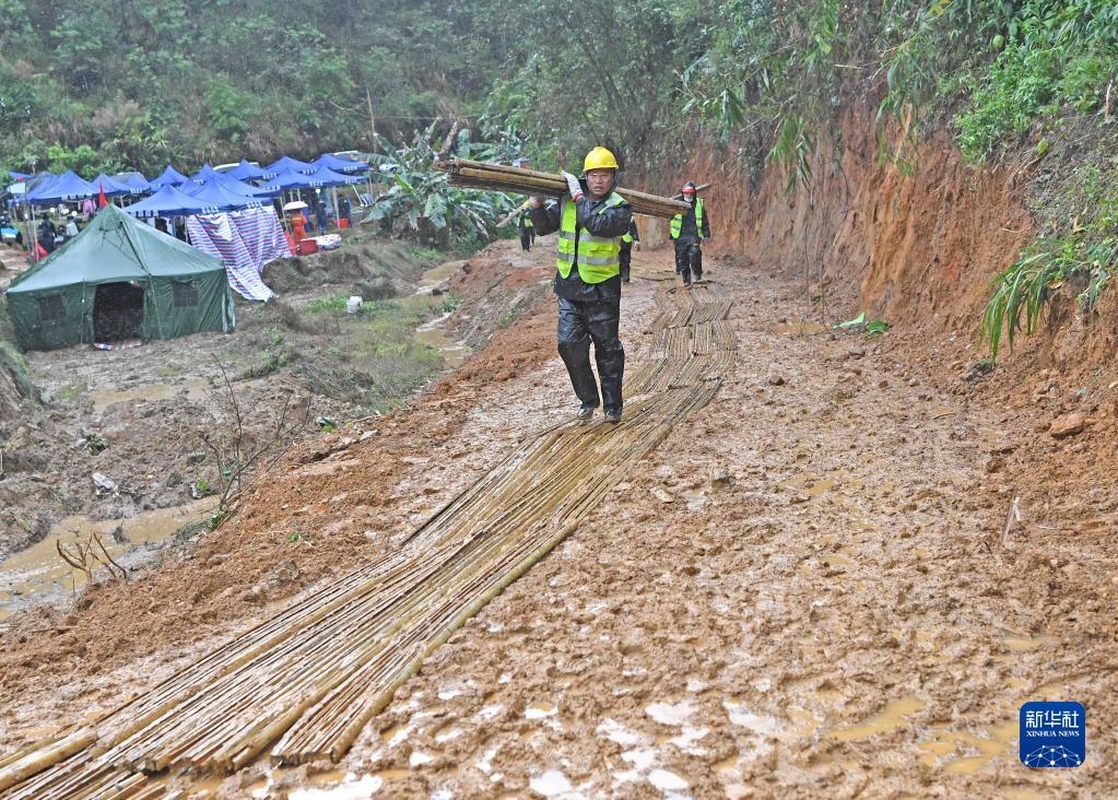 22日紧急开辟的一条通往事故核心现场的道路已经修通。为方便雨天行走,工作人员在路上铺设了一条竹编的小道。