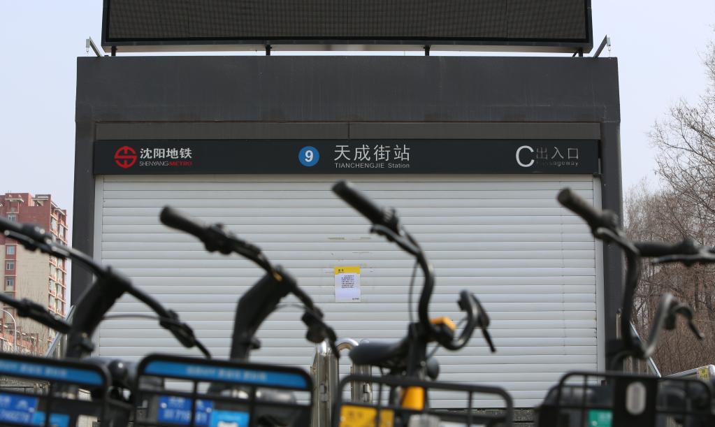 3月24日,沈阳地铁全线各站暂停运营,地铁9号线天成街站C出口大门紧闭。 新华社记者王乙杰 摄