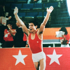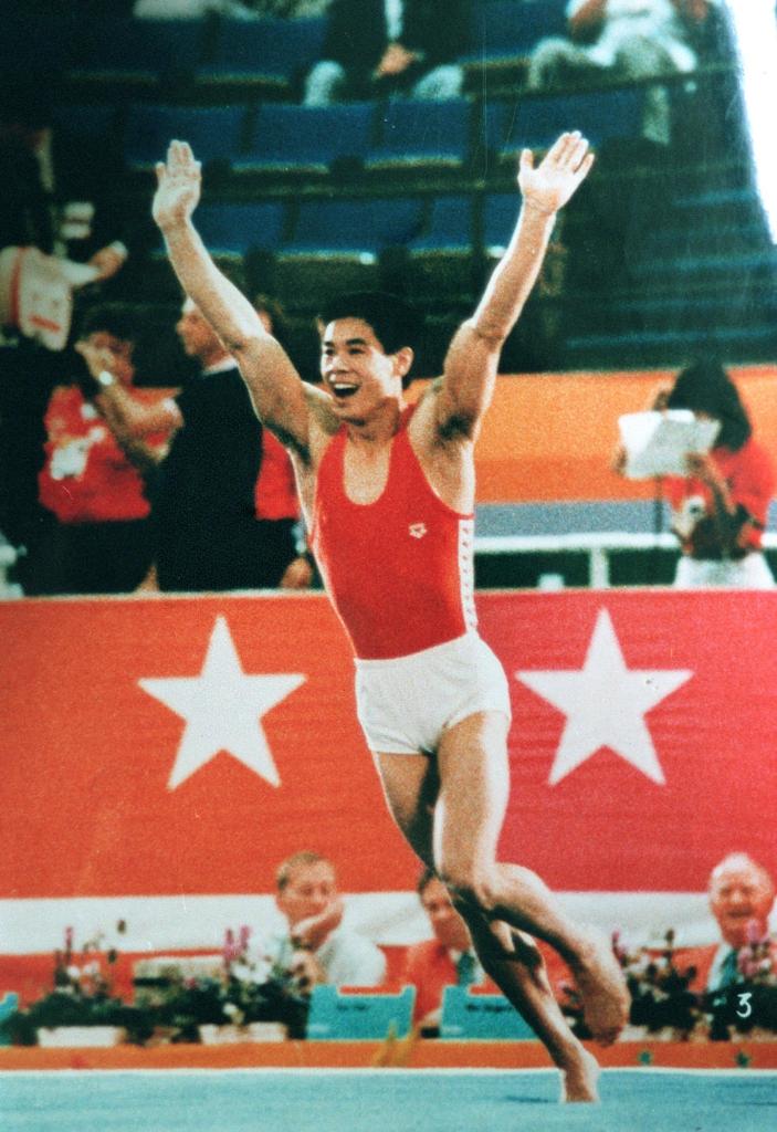这是李宁在1984年第23届洛杉矶奥运会男子自由体操决赛获得满分后欢呼的资料照片。新华社发