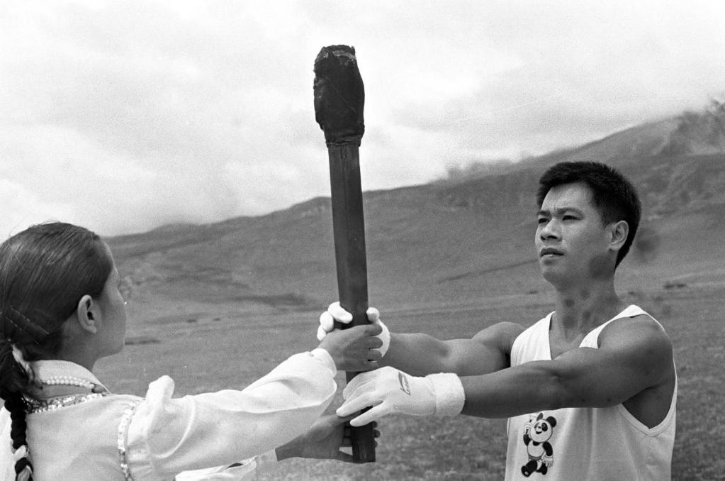 1990年8月7日,负责采集第十一届亚运圣火火种的15岁的藏族姑娘达娃央宗将火种交给李宁。新华社资料图片