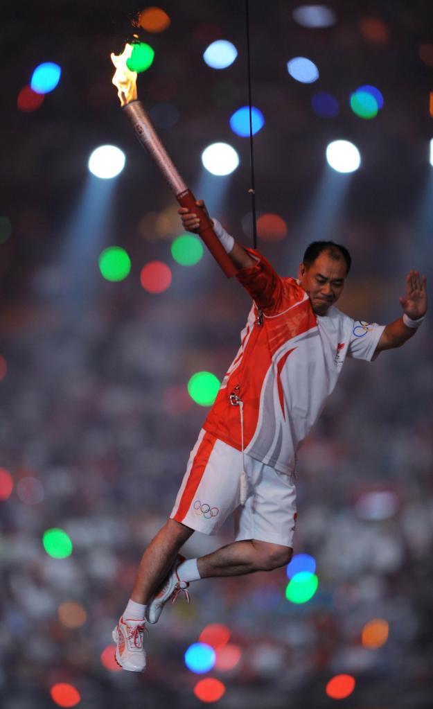 2008年8月8日,第29届夏季奥林匹克运动会在国家体育场隆重开幕。这是中国前体操名将李宁手持火炬。新华社记者罗晓光摄