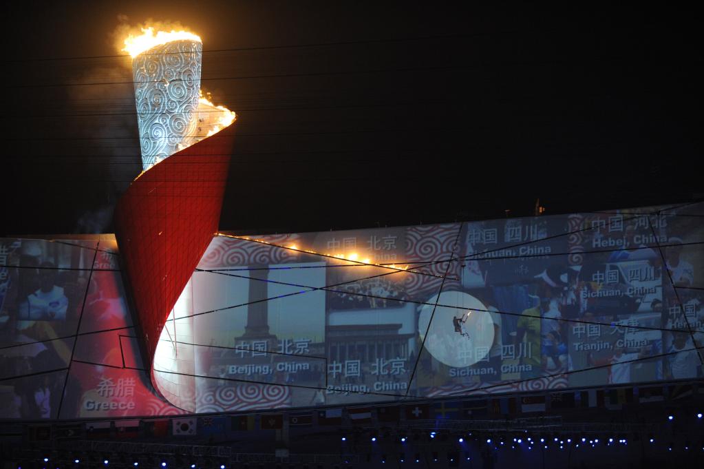 2008年8月8日晚8时,第29届夏季奥林匹克运动会在国家体育场——“鸟巢”隆重开幕。这是在开幕式上点燃主火炬的瞬间。新华社记者赵鹏摄