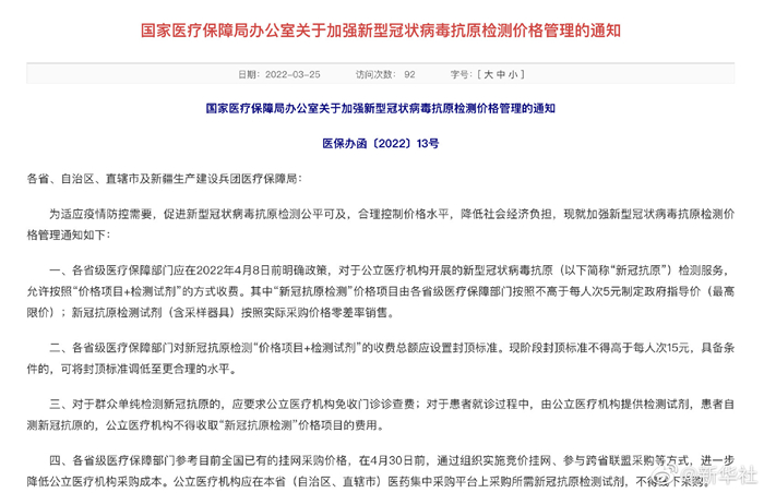 据国家医保局最新消息,各省级医疗保障部门应在2022年4月8日前明确政策,对于公立医疗机构开展的新型冠状病毒抗原检测服务,允许按照“价格项目+检测试剂”的方式收费。其中“新冠抗原检测”价格项目由各省级医疗保障部门按照不高于每人次5元制定政府指导价(最高限价);新冠抗原检测试剂(含采样器具)按照实际采购价格零差率销售。(记者彭韵佳)
