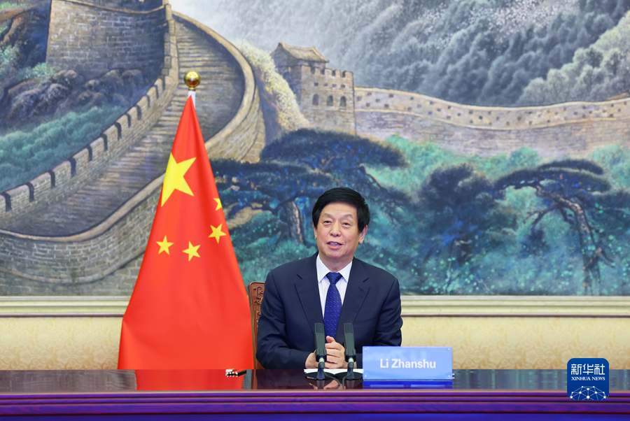 3月25日,全国人大常委会委员长栗战书在北京人民大会堂以视频方式同吉尔吉斯斯坦议长马梅托夫举行会谈。 新华社记者 姚大伟 摄