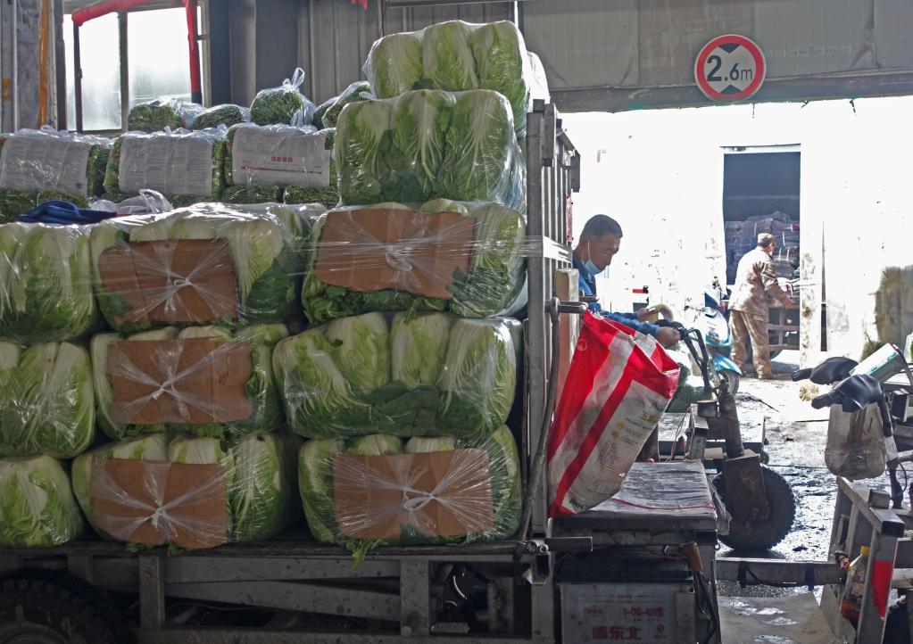 沈阳盛发蔬菜批发市场内,商贩正在装载白菜。新华社记者 张琦汝 摄