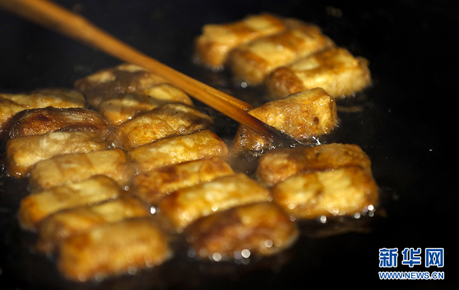 说起“徽州毛豆腐”,不得不提及其非遗传承人蒋光明和罗志敏,堂姐弟二人均是“罗氏毛豆腐”创始人罗秀峰第五代嫡孙(蒋光明随母姓)。姐弟俩渴望将祖传的“罗氏毛豆腐”进一步做大做强,2008年,在父辈精心传授指导下创办了黄山市徽州区呈坎罗氏豆制品加工厂,专业生产毛豆腐。作为徽州毛豆腐省级非遗传承人,蒋光明精心研究、改良,用优质黄豆,经筛洗、浸泡、磨浆、过滤、压制、切块和发酵等古法工序,将毛豆腐这道经典徽菜做到极致,深受食客们的喜爱。同时,让味蕾上的徽州记忆得以传承。 新华网发(施亚磊 摄)