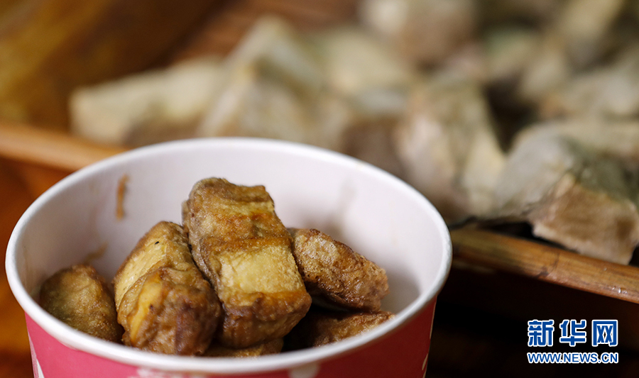 煎炸烹饪完成的徽州毛豆腐(3月14日摄)。