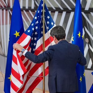 3月24日,工作人员在比利时布鲁塞尔的欧盟总部整理美国国旗。新华社记者张铖 摄