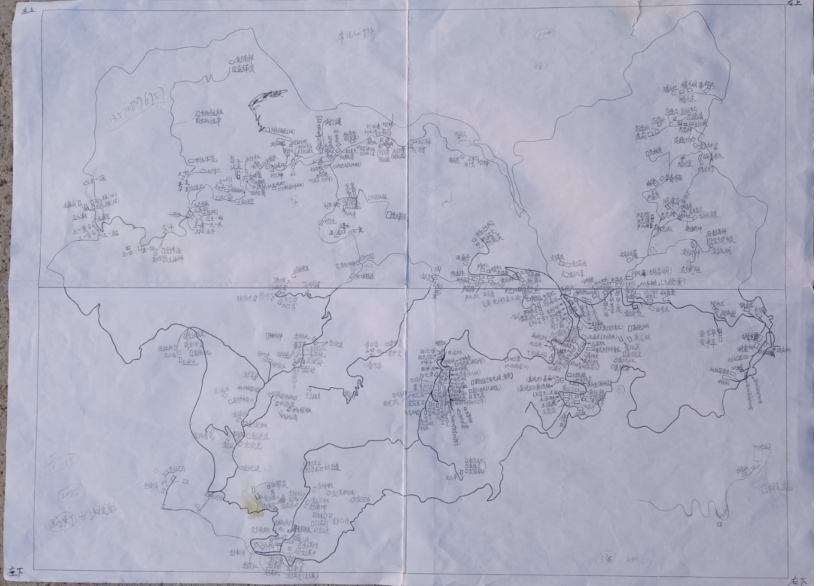 有的组在山坳,有的组在山坡,彭海斌每走一段路就在图上描一段,哪儿拐弯,哪儿直行都在图上表现出来。从9张局部图到最后青艾村的整体图,彭海斌花了近2个月的时间绘制完成。