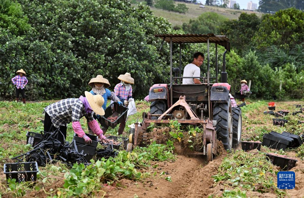 3月26日,工人在文昌市昌洒镇田间采收地瓜。