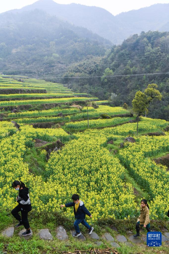 当日,浙江省建德市乾潭镇胥岭村开启首届“花朝节”,市民和游客在胥岭村观赏油菜花,体验胥岭古道和“花朝市集”。