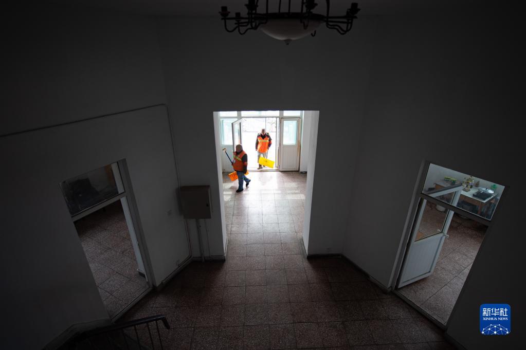 3月19日,宋宝(前)和宋臣清扫完瞭望塔外的积雪后返回塔内。