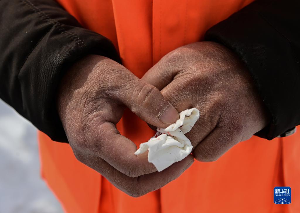 宋臣在瞭望塔外的院子中清理积雪时不慎被雪铲割伤手指(3月19日摄)。