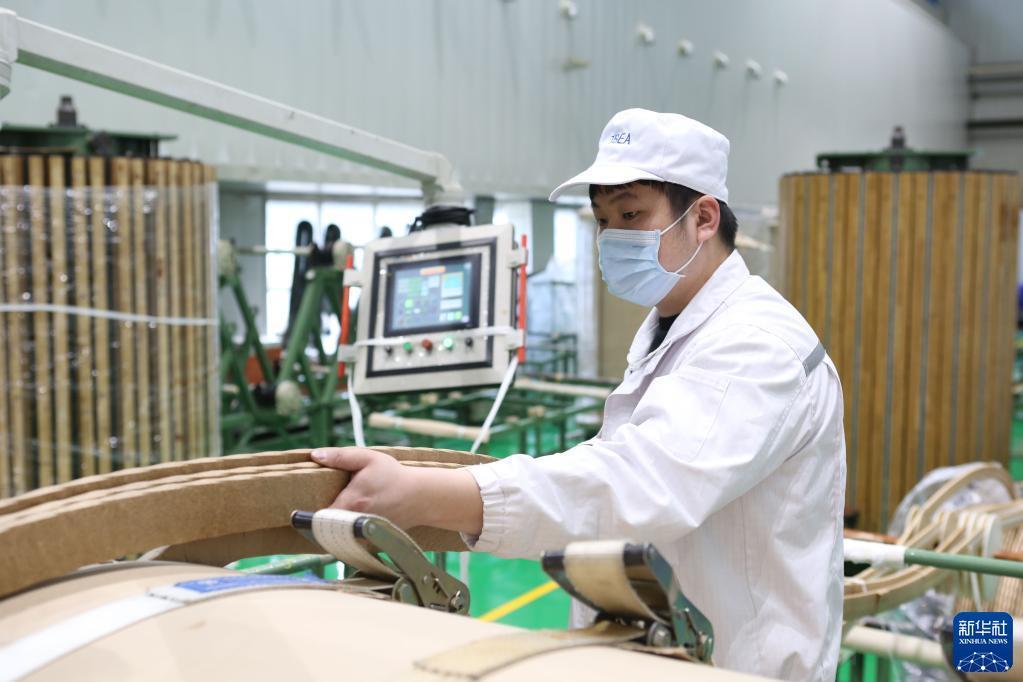 3月27日,在位于辽宁省沈阳市铁西区的特变电工沈阳变压器集团有限公司,工人在生产白鹤滩-浙江特高压直流输电工程产品。