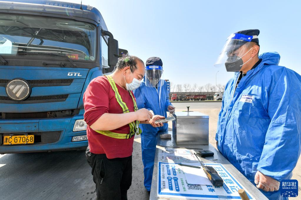 3月28日,在天津市新天钢联合特钢有限公司,厂区保安对外来人员进行体温检测、信息登记、健康码及行程码核验。
