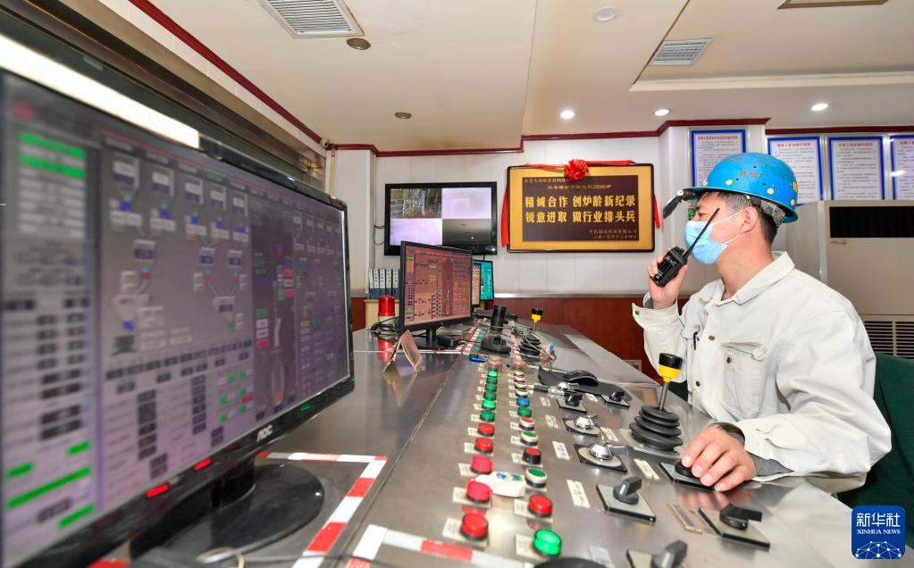 3月28日,在天津市新天钢联合特钢有限公司,转炉主控工在主控室用对讲机协调生产。