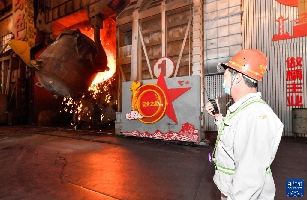 3月28日,在天津市新天钢联合特钢有限公司,指车工在转炉平台与天车司机进行对讲沟通。