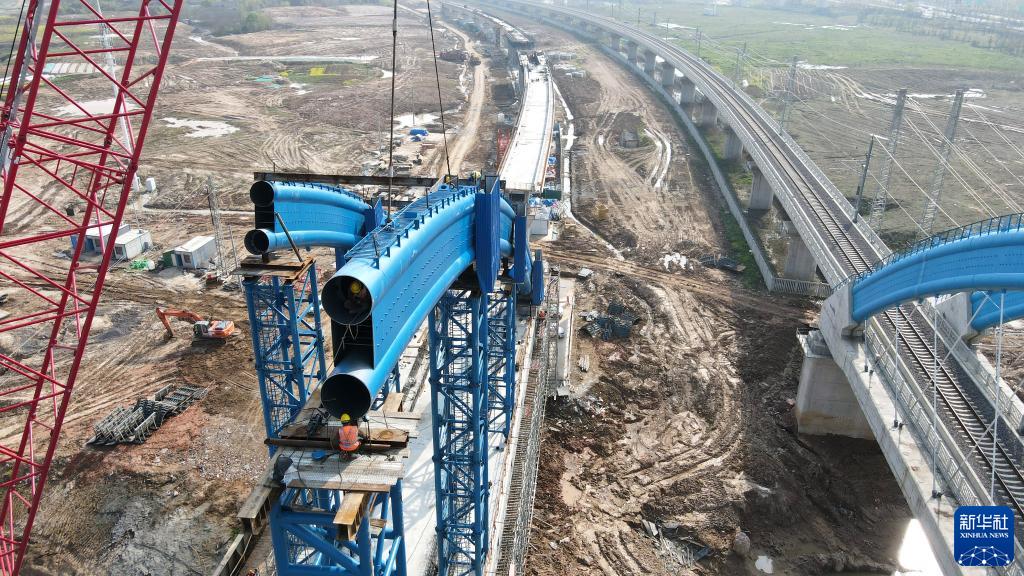 3月28日,工人在中铁四局引江济淮工程江淮沟通段合九铁路改建工程施工现场作业(无人机照片)。引江济淮工程沟通长江、淮河两大水系,是我国跨流域、跨省重大战略性水资源配置和综合利用工程。