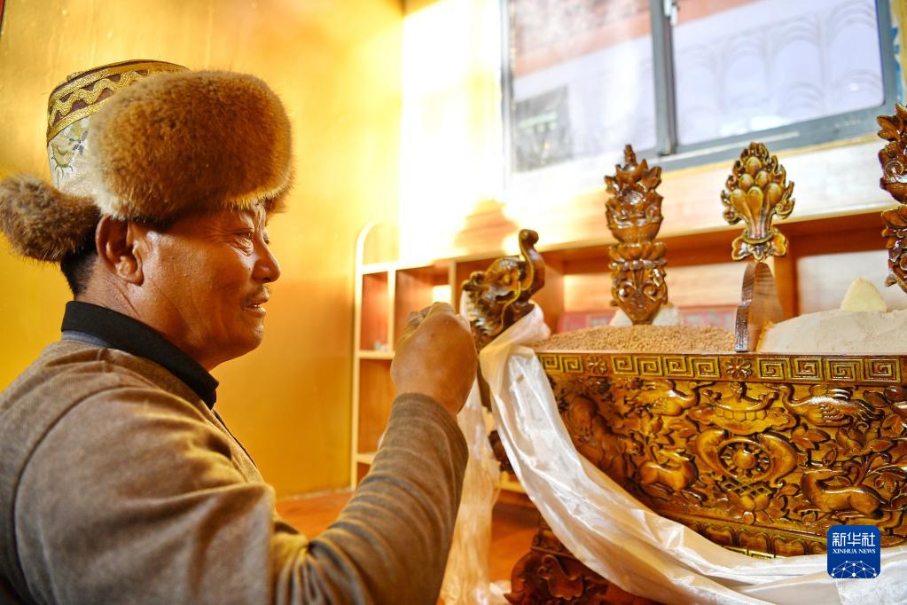 在湘河水库移民新村,搬迁群众罗布占堆在新家的切玛盒前祈福(3月27日摄)。