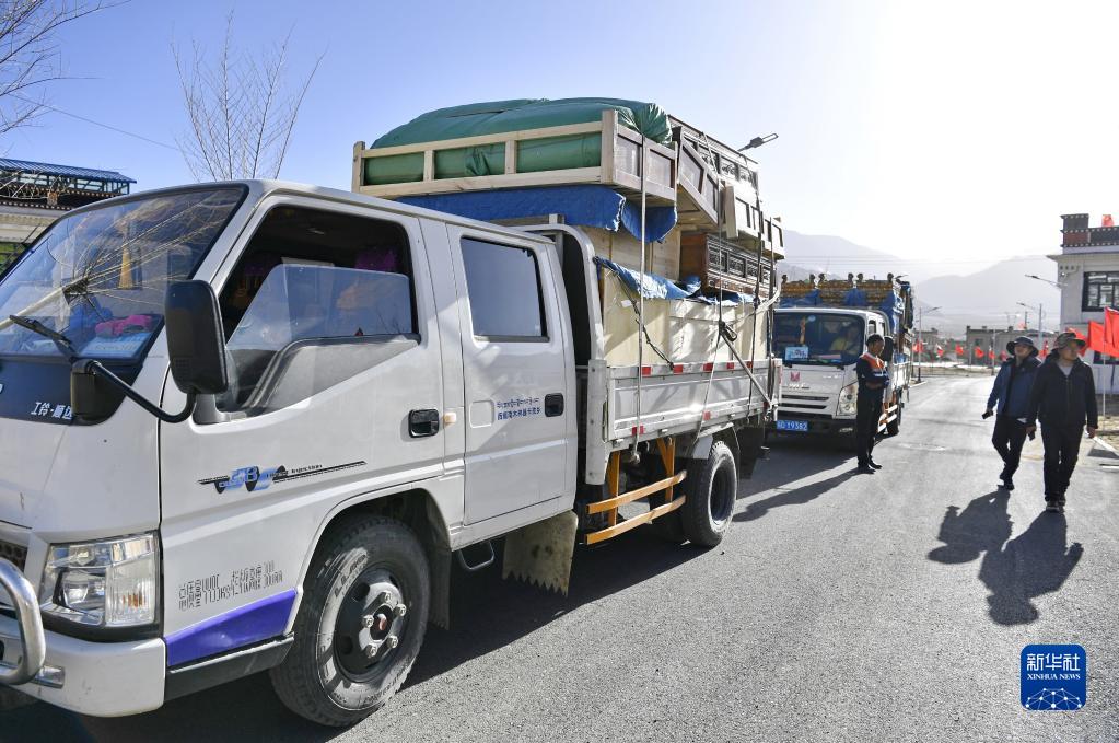为搬迁群众运送家具的车辆驶入湘河水库移民新村(3月27日摄)。