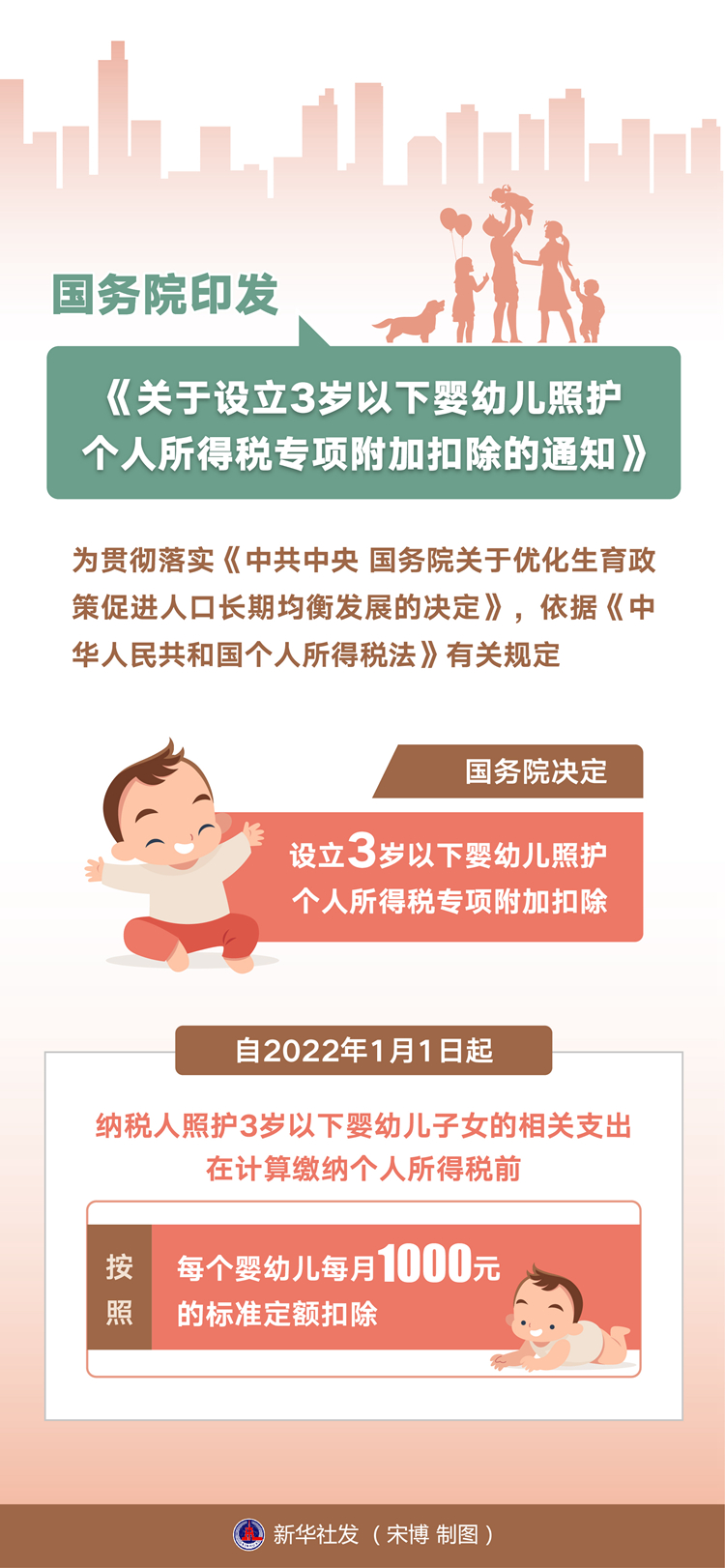 此次印发的通知明确了政策实施的具体安排:自2022年1月1日起,纳税人照护3岁以下婴幼儿子女的相关支出,在计算缴纳个人所得税前,按照每个婴幼儿每月1000元的标准定额扣除。