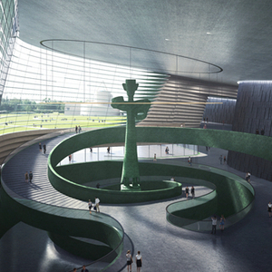 设计取意“堆列三星,古蜀之眼”,青铜面具通过极富表现力的眼睛,仿佛在与观众进行一场穿越时空的对话。我们设计的“古蜀之眼”——新馆外立面上两个巨大的玻璃窗口,就像三星堆青铜面具中的眼睛一样成为视线交流的核心。同时我们将老馆经典的螺旋曲线外墙延续展开,作为新馆外形和内部空间的控制曲线。建筑屋顶倾斜延伸,消隐融入场地,与原有一号馆形体左右呼应,建筑形成三个沿中轴排列的覆土堆体——寓意“堆列三星”。