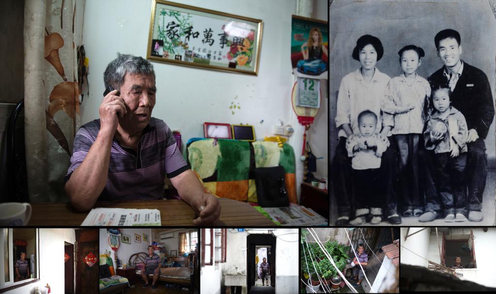 左上:马庭宝在家中和同样是幸存者的哥哥马庭禄通电话;右上:摄于1967年的马庭宝(右一)家的全家福(翻拍照片);下一至下五依次为:马庭宝在窗前,马庭宝在自己家中,马庭宝进出院门,马庭宝在自家小院浇花,马庭宝在窗前眺望(拼版照片,2017年7月14日摄)。 新华社记者 韩瑜庆、李响、季春鹏 摄