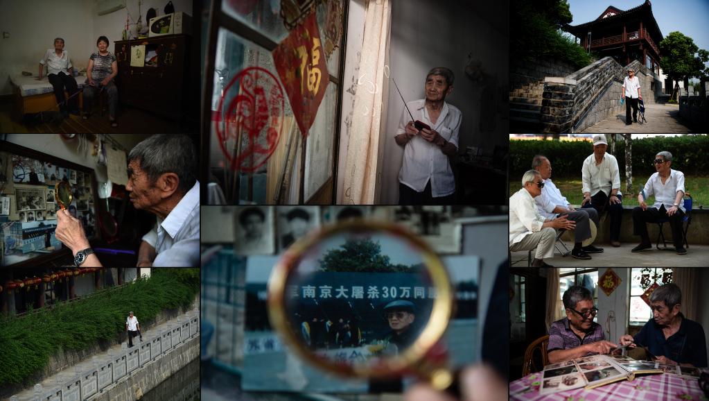 中上:马庭禄在家中收听广播;中下:马庭禄用放大镜查看自己参加南京大屠杀71周年纪念日活动的照片;左上:马庭禄和老伴在家中合影:左中:患有眼疾的马庭禄用放大镜看老照片;左下:马庭禄在秦淮河边散步;右上:马庭禄从南京一处明城墙边经过;右中:马庭禄在街心公园与熟人聊天(2017年5月26日摄)。右下:马庭禄(右)和同样是幸存者的弟弟马庭宝在一起翻看老照片(2017年7月12日摄)。 新华社记者 韩瑜庆、李响、季春鹏 摄